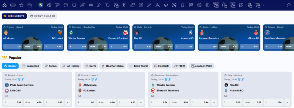 We dekken meer dan 30 verschillende sporten, waaronder voetbal, tennis, basketbal, hockey, wielrennen, formule 1, darts, snooker en zelfs e-sports. Voor populaire events zoals Champions League wedstrijden bieden we meer dan 200 verschillende weddenschaps markten per wedstrijd, van standaard 1X2 tot specifieke player props en corner counts.